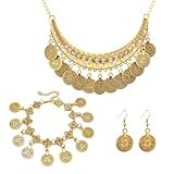 • Juego completo: el juego de joyas de oro con temática de monedas antiguas incluye un collar, una pulsera, una cadena para la cabeza y un par de aretes, lo que le brinda una experiencia de vestir única. Ya sea que los uses solos o como un conjunto completo, te convertirán en el centro de atención en diversas fiestas y cosplays.