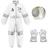 - 【DISFRAZ ASTRONAUTA NIÑO】El cuello y la cintura del disfraz de astronauta están hechos de material plateado brillante, que parece más lujoso. El disfraz de astronauta cuenta con una cinturilla elástica en los puños y los tobillos para mantener fuera el aire frío. El casco y los guantes plateados de astronauta brindan una mejor protección para los niños. Este disfraz de aventura de astronauta le brinda a su hijo todo lo que necesita para convertirse en un valiente explorador espacial.