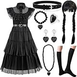 - 🖤【Completo de Disfraz】Incluye 1 vestido negro, 1 cinturón, 1 peluca realista que incluye redecilla para el pelo, 1 par de medias, 1 par de pendientes, 1 collar, 1 pulsera, 1 anillo, asegúrate de que tu niña tenga todos los accesorios decorativos necesarios para disfrazarse.