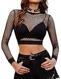 TPZORJX Camiseta Transparente Mujer Crop Top Sexy Manga Larga Malla Top Camiseta de Malla Top Transparente Blusa de Malla Negra Slim Chic Clubwear Casual Rejilla Camiseta - Negro/M